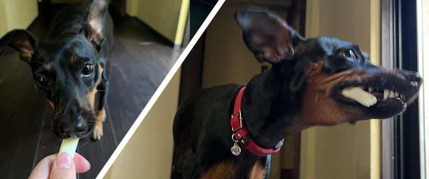 次は棒状のままいただきます。ソフトな仕上がりなので、固さも問題なく、ガム風オヤツのようによく噛んで食べていました。