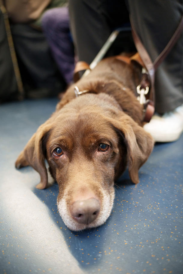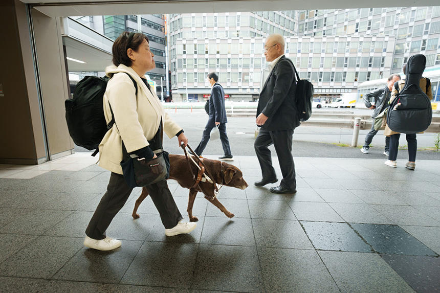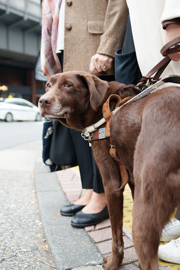 横断歩道での安全確認や駅構内の歩行は、杢尾さんとアイメイトの共同作業。エスカレーターに上手に乗れた時などには、「グッド、グッド!」と褒めてあげます。「上手にできたら褒める」は、アイメイトとのコミュニケーションの基本です。杢尾さんはリタイアの瞬間まで、これを続けました。
