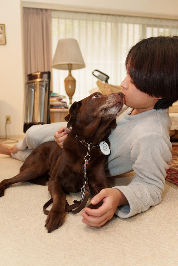 その前に、一度ここでお別れとなる息子さんとごあいさつ。お仕事中のアイメイトには、使用者本人以外は触ってはいけませんが、ハーネスを外してくつろいでいる時は一般の家庭犬と変わらない家族のアイドルです。現在大学生の息子さんにとっても、一緒に育ってきたアイメイトとの別れは、とても名残惜しいことでしょう。アイメイトも、別れを告げる息子さんの目をじっと見て、愛情に応えていました。