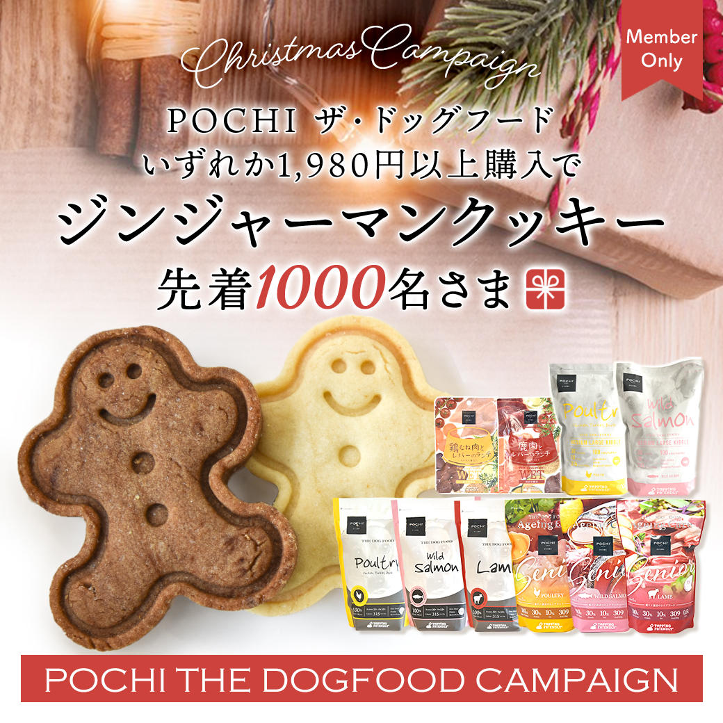 POCHI ザ・ドッグフード ドライフード・ウェット各シリーズいずれか1,980円以上をご購入の方にプレゼントするのは、保存料などは一切使用せず、手作りで一枚一枚丁寧に焼き上げた「ジンジャーマンクッキー」。