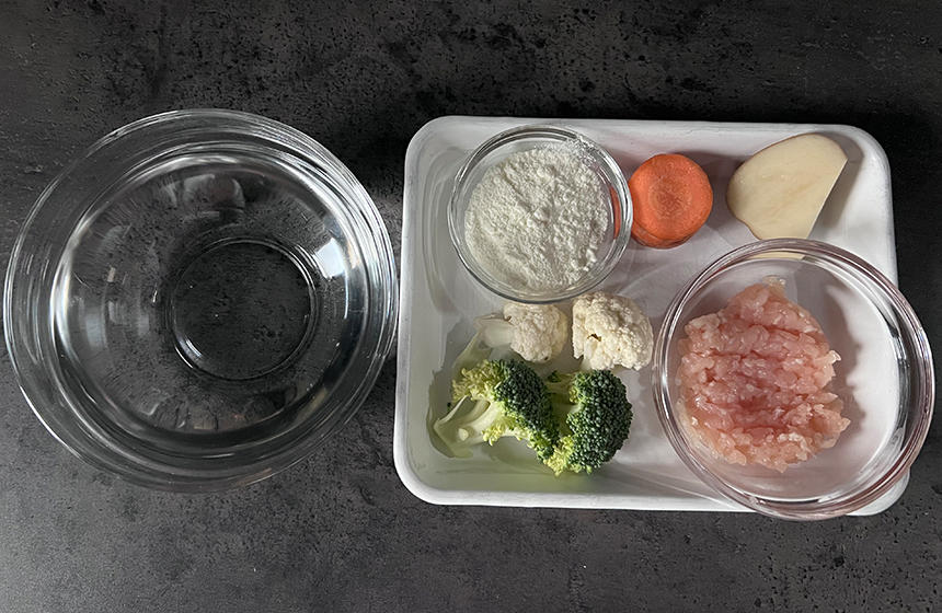 じゃがいもはエネルギー源、人参は目や皮膚の粘膜を健康に保つβカロテン、ブロッコリーは抗酸化作用を持つビタミンC、カリフラワーは食物繊維、鶏ひき肉は良質なタンパク質が含まれています。