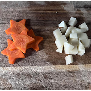 2.じゃがいもは皮を剥き、2cmくらいの角切りに、人参は皮を剥き5mm幅の輪切りにカットし、星型に型抜きしておく。それぞれ柔らかくなるまで茹でる。