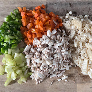 1.人参、ピーマン、えのき、マッシュルーム、セロリは細かくみじん切りにしておく。