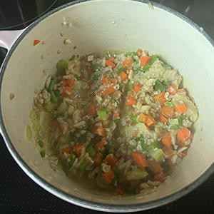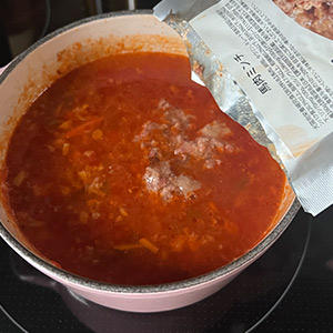 4.3に水、POCHI 馬肉ミンチ 80gをいれ、沸騰したら弱火で15分ほど煮る。冷めたら完成。