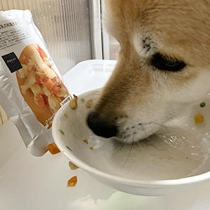 うちの子は野菜が嫌いなのでどうだろう。と思いながら、犬にお皿を見せると、いつもの通りお皿の中を覗き込み、しっぽブンブンで頂戴!頂戴!という反応でした。食いつきは良かったです。