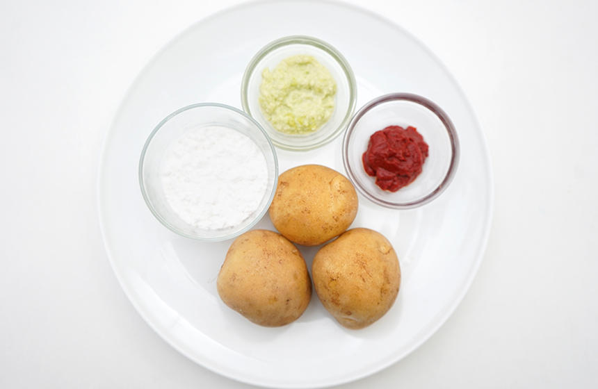 3.②に片栗粉を入れ、混ぜたら3等分にわける。1つ目はトマトペースト、2つ目には枝豆ペースト、3つ目はなにもいれず、手でよくこねる。(このとき生地が緩い場合は片栗粉を少しずつ足す)