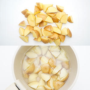 1.じゃがいもは皮つきのまま乱切りにして竹串がスッとはいるくらい柔らかくなるまで茹でる。
