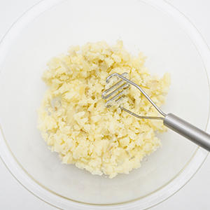 2.①の水気をしっかり切り、皮をむき(やけどに注意)マッシャーですりつぶす。