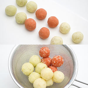 4.③をそれぞれ同じ大きさに団子状に丸め、沸騰したお湯に入れ、浮き上がったらすぐザルにあげる