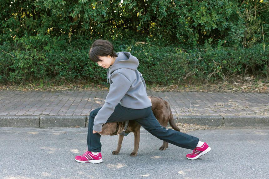 この時、ヒザに負担がかからないよう、前足のヒザがつま先よりも前に出ないよう注意します。