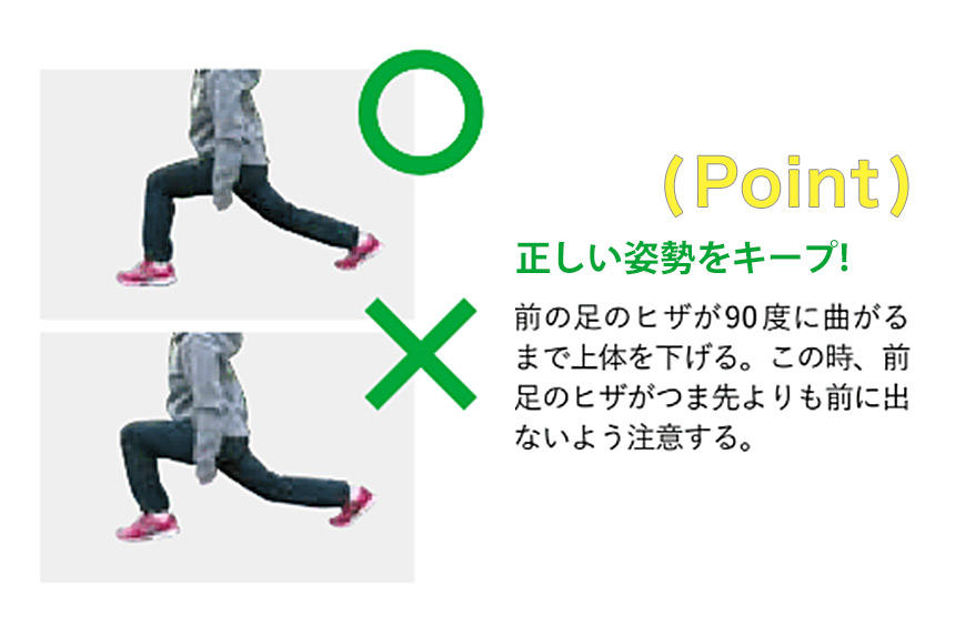 前の足のヒザが90 度に曲がるまで上体を下げましょう。