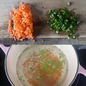 2.にんじん、ピーマンを小さくみじん切りにして、2分茹でる。水気をしっかり切っておく。(ピーマンはなくてもOK)