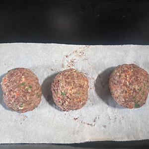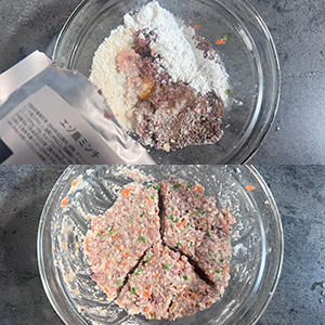 3.ボウルにPOCHI エゾ鹿 ミンチ 80g、うずらの卵1個、薄力粉5g、パン粉、②をいれ、よく混ぜ、3等分にわけておく。