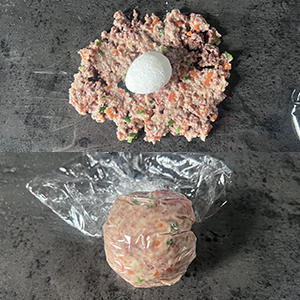 5.ラップをしき③を広げ、④のうずらを1個のせ、丸めて形を整える。これをあと2個つくる。