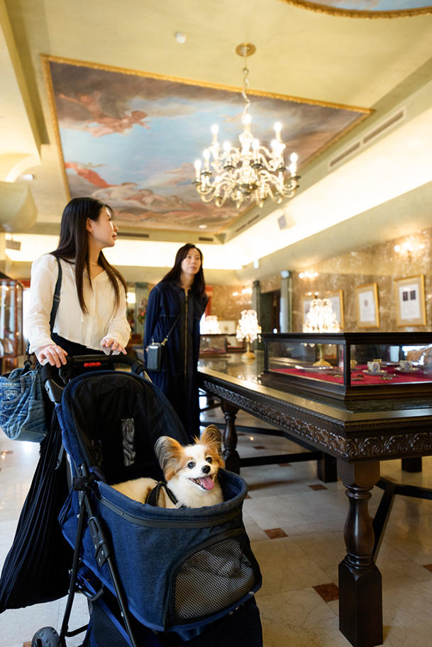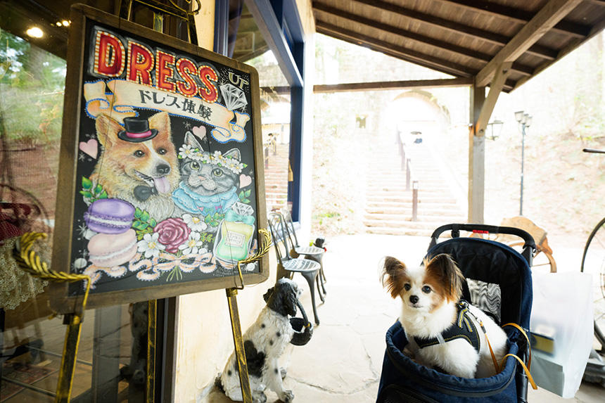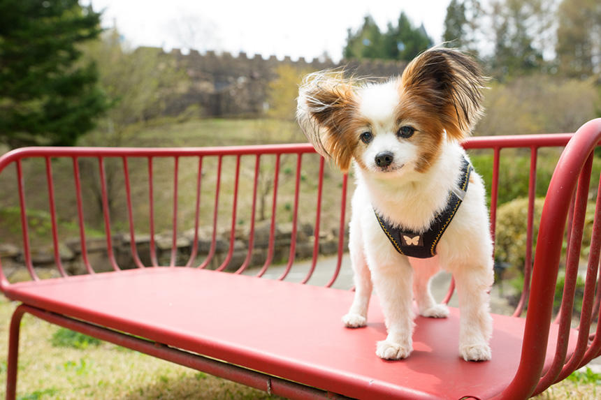 本場の“お城”を背景にしたコスプレ撮影や映画・ドラマのロケに人気の施設なのですが、私たち的に最も嬉しいのは、建物内を含めほとんどの場所にペットと一緒に入れることです。以前に一度先代犬の「マルコ」(ラブラドール・レトリーバー)と来たことがあるのですが、この春、さらにドッグフレンドリー度を強化してリニューアルオープンしたとのことで、再訪しました。今回は、パピヨンの「コロン」(14歳・メス)とご家族と一緒です。