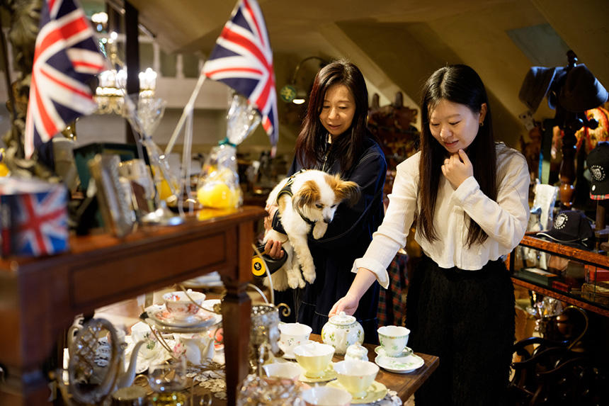 「ロックハート城」で一般来場者が見学できるのは、英国の調度品などの展示があるお城の中と本格的な英国風庭園、ショッピングエリアとレストランです。ほかに、結婚式場があり、お姫様・王子様風の衣装で場内を歩いたり写真撮影ができる「プリンセス体験」も人気です。今春のリニューアルでは、これらに加え、新たに広いドッグランスペースができました。また、レストランの一角にペットと一緒に利用できる室内席も設けられ、犬用のドレス体験コーナー(中世風のドレスのレンタル&撮影サービス)もできました。