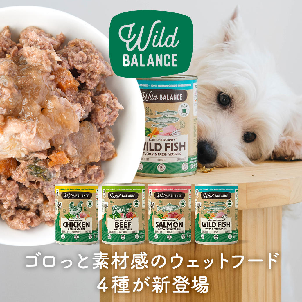 野生で生活していた頃の自然な食事を目指し、肉や野菜のみで作られゴロっとした素材感たっぷりのウェットフード缶「ワイルドバランス」をぜひお試しください。