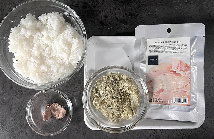 鶏ささみが大好物という犬は多いので、おにぎりにしたときに鶏ささみが見えるように握ると食いつきが良くなり、見た目もよく仕上がります。