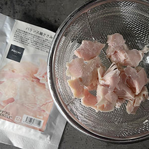 1.POCHI バランス鶏ささみカット 40gを袋から取り出し汁切りし、大きめにさいておく。