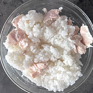 2.ボウルに白飯、①のささみをいれさっくり混ぜる。4等分にわける(1個あたりが約が80gになるように)。