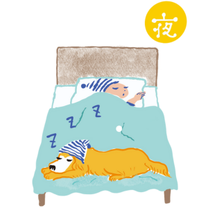 夕方の散歩やごはんの後は、穏やかに過ごしましょう。「心包(しんぽう)」や「三焦(さんしょう)」 の時間帯には、人間なら入浴やストレッチがリラックスがオススメです。犬へは肉球マッサージなどをして一緒にゆったりと過ごさせましょう。23 時の「胆」の時間には就寝を。「肝」 の時間帯には、熟睡して肝を休ませることが大切です。寝る環境にもよりますが、犬は飼い主のそばで寝るのがいい睡眠につながるでしょう。