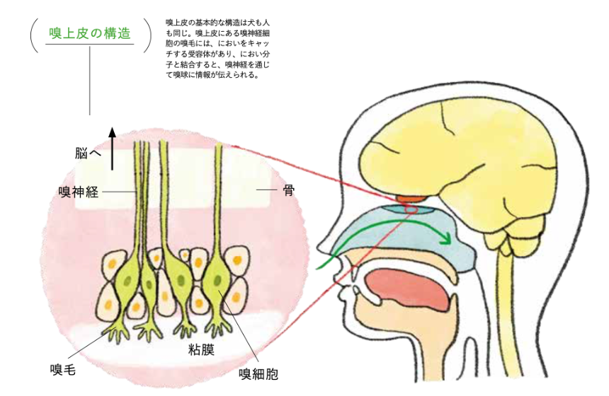 「人間も犬も哺乳類なので、基本的な構造は同じですよ」と言うのは、嗅覚やフェロモンに関する遺伝子の研究を行う新村芳人先生。「空気中を漂っているにおい分子が鼻の中に入り、嗅上皮(きゅうじょうひ)という場所で捉えられます。嗅上皮にはにおいを受け取る嗅神経細胞が集まっていて、嗅毛(きゅうもう)と呼ばれる毛が生えています。その先にはにおいセンサーであるさまざまな受容体があり、それぞれ結合する分子が決まっています。その信号が嗅神経を通じて“においの脳”である嗅球(きゅうきゅう)に伝わり、認識されるという流れです。これはどんな哺乳類でも同じなのです。ただ、人と犬の鼻の違いのポイントは、“嗅上皮の大きさ”、“におい受容体の種類の数”、“鼻の外側の構造”です。犬は人の30倍の大きさの嗅上皮を持っていて、受容体の種類は約2倍。さらに、人にはない鼻鏡という鼻先の構造が、空気を効率よく取り込むのを助けるため、犬は人よりもはるかに嗅覚が優れているのです」。