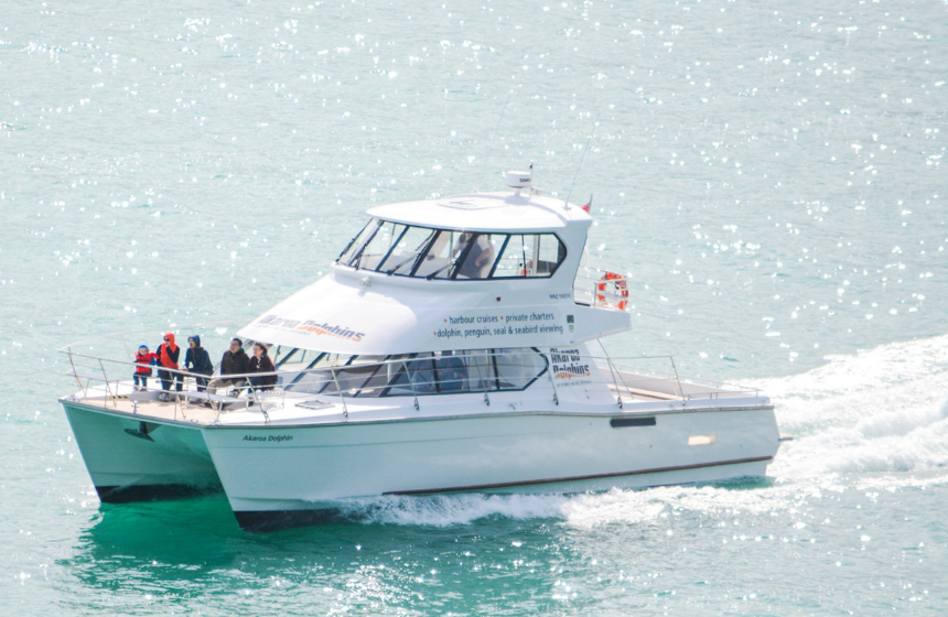 ドルフィン・ドッグと呼ばれる犬が働いているのは、南島アカロアの「アカロア・ドルフィンズ」社。アカロアは南島最大の都市クライストチャーチから車で1時間30分ほど。2つの火山が侵食されて形成されたバンクス半島に位置する港町です。「海生哺乳類保護区」に指定されている沿岸の海域一帯にヘクターズ・ドルフィンが生息しており、観光の目玉として観察クルーズが行われています。