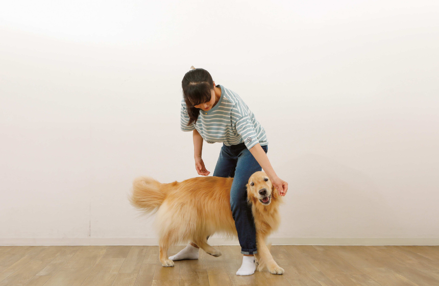 股くぐりは、ドッグダンスなどでもよく使われるワザの一つです。飼い主の股の間をクルクルと8の字にくぐらせますが、実は犬のバランス感覚を養うための立派なエクササイズでもあります。オヤツを上手に使ってスムーズに誘導しましょう。