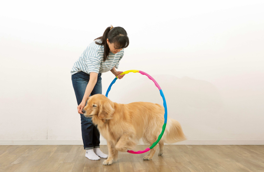 四肢をしっかり使う練習。まずはフラフープを床につけた状態からスタートします。犬に輪の中をそのまま通り抜けさせます。これができたら輪を1cmほど床から離し、再び通り抜けを指示します。徐々に床から離していきましょう。ゆっくり通り抜けるのがコツです。