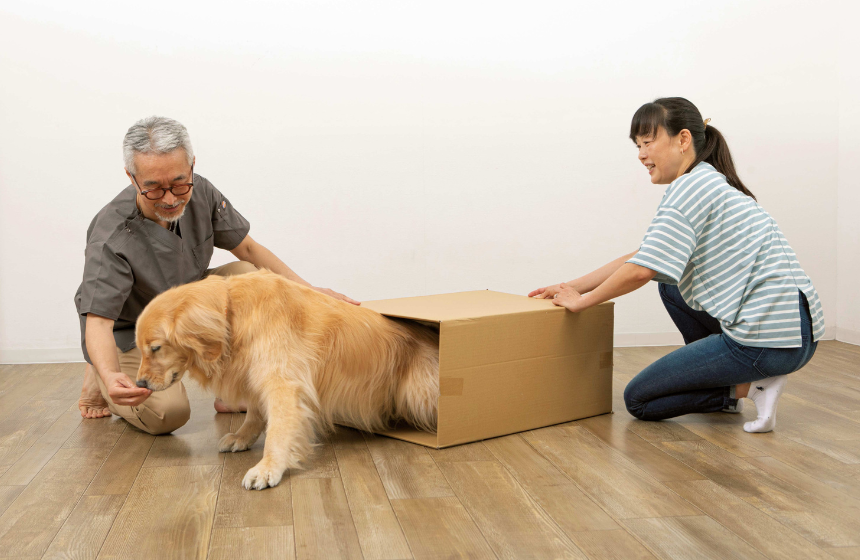 3.箱の中から脱出できたらオヤツを与えてほめてあげましょう。ゲーム感覚で何度も繰り返し行います。