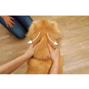 犬の肩付近に両手を添え、背骨に沿って上から下になで下ろしていきます。繰り返すうちに犬の体がポカポカしてくるのがわかります。
