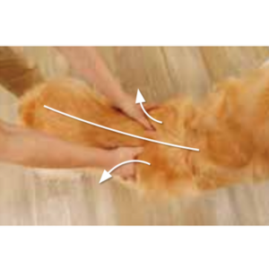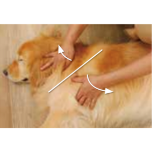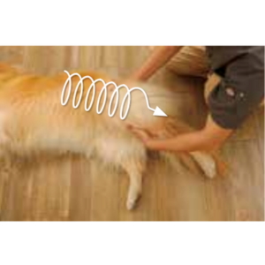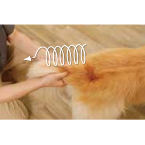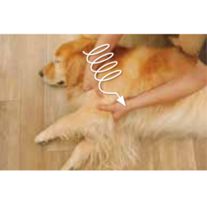 片方の手でそっと犬の体を支え、もう片方の手でシッポのつけ根から先まで、大きく円を描くように優しくマッサージをします。数回繰り返します。