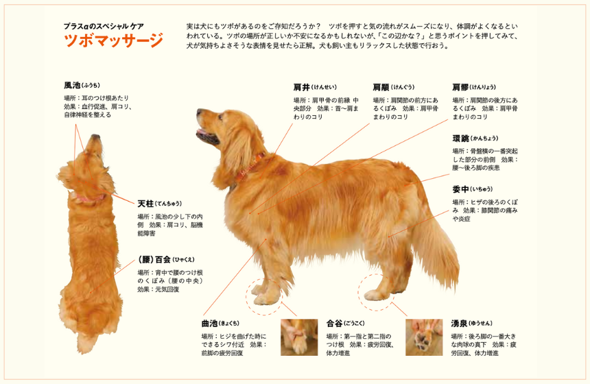 下半身にも疲労がたまるので、丁寧にもみほぐしてあげましょう。マッサージ中、脚のつけ根やヒザ関節などが柔軟に動くかなどもチェックします。犬が抵抗する場合は、痛みを感じている可能性があるので少し様子を見て、嫌がり方が強いようなたら病院で診てもらいましょう。
