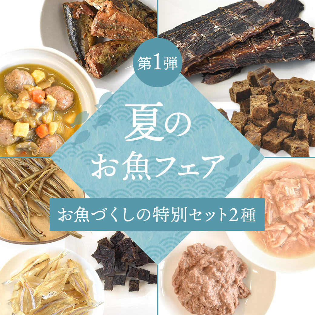 サーモンとカツオ、イワシのミートボールにサバの煮込み、計4種のパウチに、ジャーキーや素干しなどのお魚オヤツ4つを特別セットにしました。