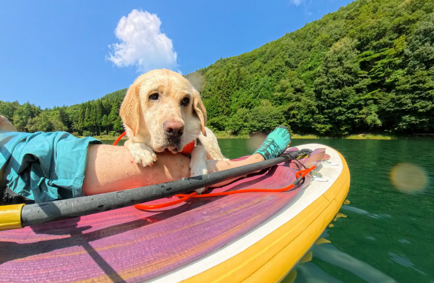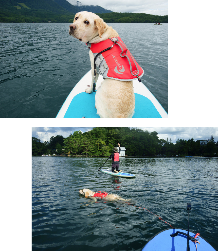 初めて一緒に迎えた去年の夏は、水泳とSUP(スタンド・アップ・パドルボート)にも挑戦しました。足がつかない深場にはなかなか自分では入りませんが、ライフジャケットのハンドルを持って一緒に入っていくと最初から上手に泳ぎ始めました。SUPに乗るのも風を感じて楽しそう。少々無理矢理SUPから水中に放り込むと、ぐいぐい泳いでリードで繋がっているSUPごと引っ張っていってくれました。