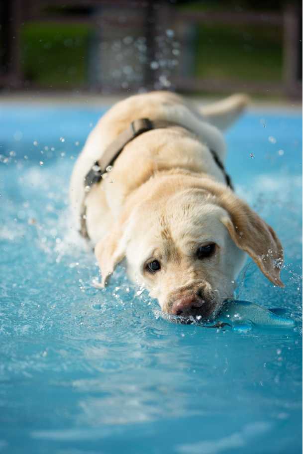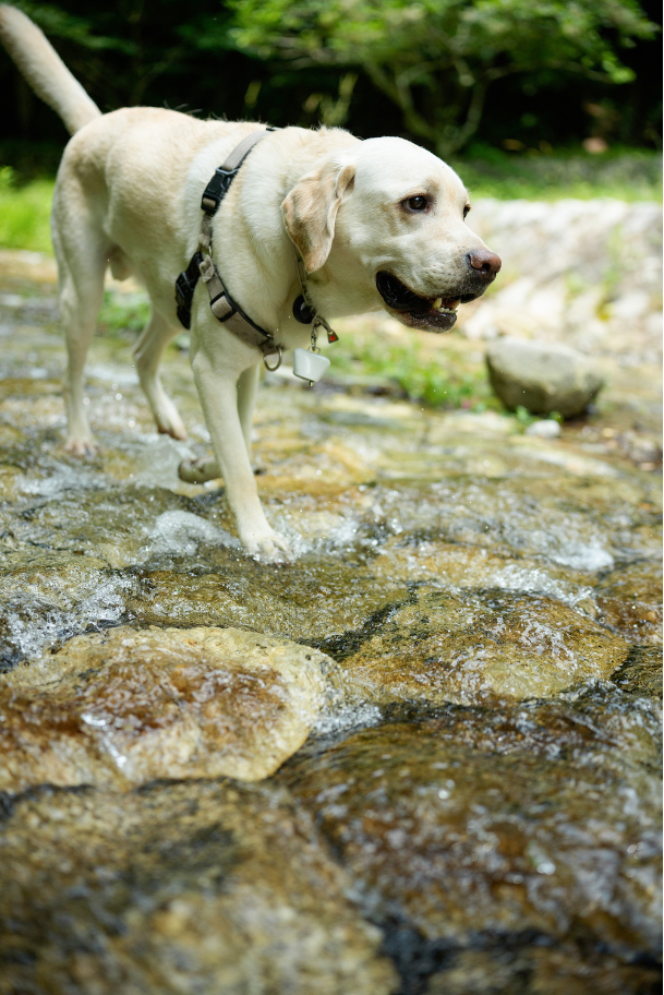 さて、この夏は温暖化が進む近年でも、特に暑いですね。我が家は避暑地の軽井沢地域にありますが、以前は滅多に超えることがなかった30度オーバーが当たり前の夏を過ごしています。ルカを連れて楽しめる涼しい散歩場所や遊び場を探すのにもひと苦労。山に入ればだいぶ涼しくはなるのですが、今度は熊の出没情報が異常に増えているので、あまり人里離れた山間部には近づけません。そこで、ある程度開けた場所にある川・湖や、整備されたプール付きドッグランなどの水辺に行く機会が増えています。そして、ルカの場合、この水辺での遊び方が、アイメイト候補犬から家庭犬になったことに伴う「変化」を感じさせる指標の一つになっています。