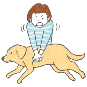 犬の呼吸が止まってしまった時、飼い主に唯一できることが心肺蘇生法です。ぬいぐるみなどを使い、「犬が倒れているのを発見した」といった具体的なシチュエーションを想定して、上部チェックリストから一連の流れを練習しておきましょう。