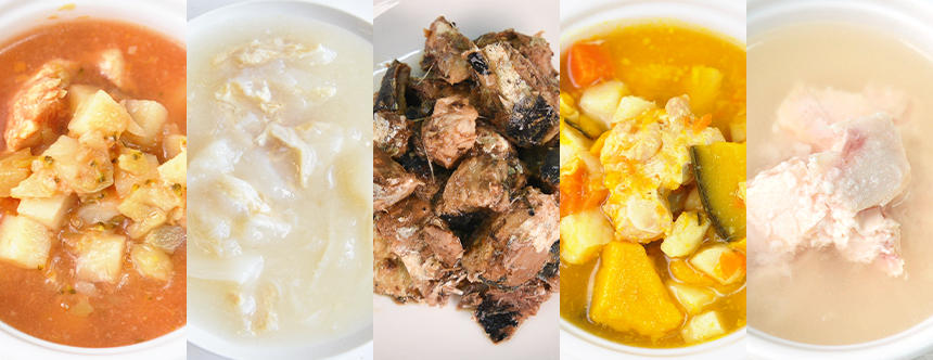 ひんやり冷たくしてもおいしい「鶏やげんレトルト」に、冷製スープとしても楽しめて水分補給も兼ねたスープ系3種、DHA、EPAも含み、イワシの香りが犬たちの食欲をそそる「サーディンオールイート」の計5種類のレトルトをセットにしました。