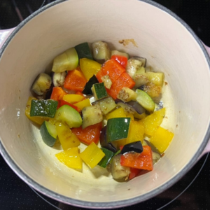 2.鍋にオリーブオイルをしき、①の具材をいれ蓋をして弱火で10分放置する。