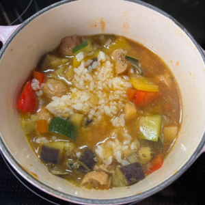 4.③に白飯をいれ、1分ほど煮たら粗熱がとれるまで冷まし、冷蔵庫で冷ます。