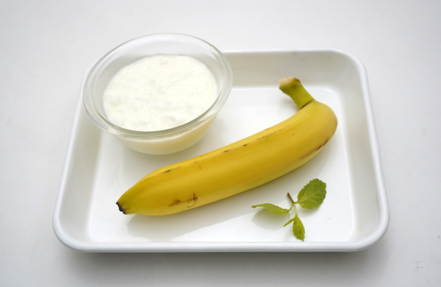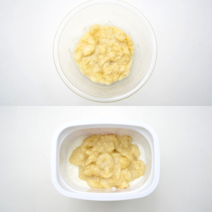 1.200g入っているヨーグルトパックの中に小さくつぶしたバナナを入れ、よく混ぜる。