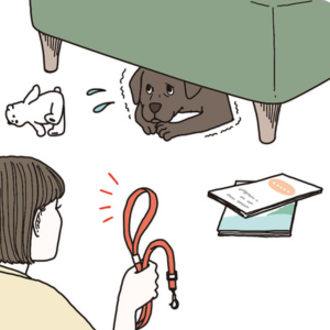 自分の安全確認が終わったら、犬の状況を確認します。床にガラスなどが落ちている場合は、むやみに呼ばず、落ち着いて探し、犬を見つけたら、リードを着けます。その後、いつでも避難できる準備を始めましょう。