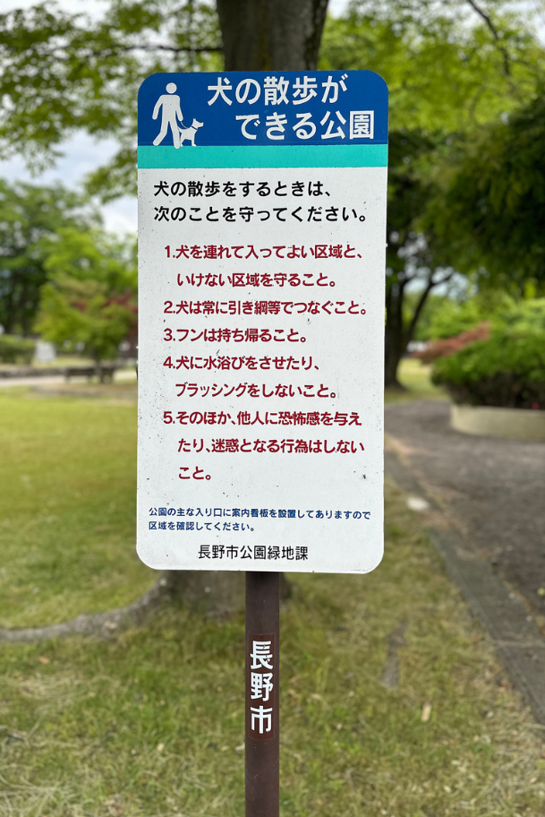 こうして開放された長野市の公園には「犬が散歩できる公園」という看板が立っています。そこには、入れるエリアと入れないエリアが色分けされた地図と、「リード着用」「フンの持ち帰り」「ブラッシング・水浴び禁止」などの守るべきルール・マナーが書かれています。今回、市の担当者に改めて色々と伺ったのですが、「条例を見直す時期に来ているのは確かですね」とのこと。今後の動きにも、引き続き注目していきたいと思います。