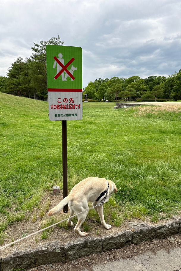 我が家があるのは長野県東部の御代田町という小さな町なのですが、南隣りの地域の中核市である佐久市では、条例により公園への犬の立ち入りが全面的に、あるいは芝生には入れないなど部分的に禁止されています。東隣りの軽井沢町や西隣りの小諸市では全面禁止はないですが、主だった公園で芝生などへの立ち入りを禁止しています。結果的に、犬の入場を特に制限していない地元御代田町の2つの公園と、勾配が比較的少なく遊歩道には辛うじて入れる軽井沢町の公園の1つで、犬が苦手な人が少ないであろう夕暮れ時や夜に練習をしました。できることなら、「犬連れ禁止」と一括りにせず、多様なニーズに目を向けて欲しかったというのが本音です。