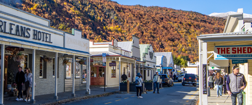 アロータウンはそのクイーンズタウンから車で約20分のところにあるノスタルジックなスモールタウン。19世紀にゴールドラッシュで栄えた歴史を持ち、当時の町並みがいまも保存されています。町を流れるアロー川沿いやメインストリートにヨーロッパから持ち込まれたカエデやポプラ、オークなどが林立し、4月に入ると町全体が黄色や赤で彩られます。
