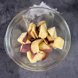 2.①のさつまいもを耐熱ボウルに入れ、ラップをして500wで3分加熱する。