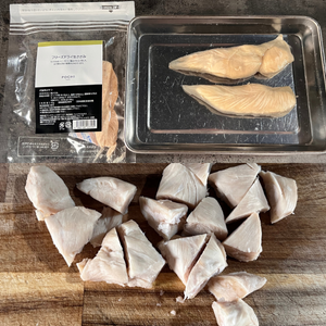 3.POCHI フリーズドライ生ササミは温湯(分量外)に浸して戻し、さつまいもと同じ大きさにカットする。