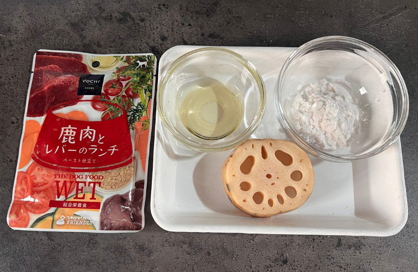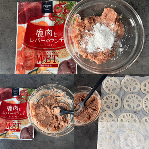 寒くなり始める10月に、ほっこりするあったかごはんはいかがでしょうか?今回は、ジビエ肉を使ったれんこんのはさみ揚げ風。秋の野菜であるれんこんを使ってPOCHI ザ・ドッグフード ウェット 鹿肉とレバーのランチを挟んで焼き目を付け、はさみ揚げ風の見た目に。