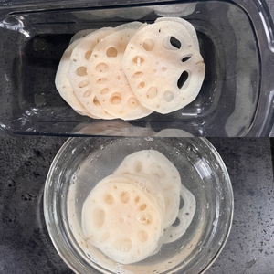 1.れんこんは洗って皮をむき、スライサーで薄くカットする。5分くらい水にさらして水気を切っておく。(れんこんスライス12枚分)