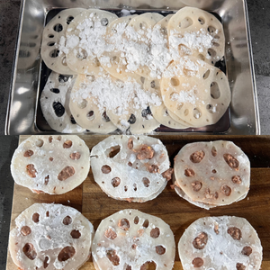 3.①を残った片栗粉で両面にまぶしつけ、余分な粉ははたく。②のたねをのせ、れんこんではさみ、軽く押し付ける。残りも同じように作る。(出来上がり6個)